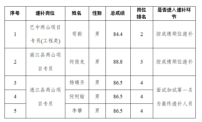 根據(jù)《巴中發(fā)展控股集團(tuán)有限公司公開招聘工作人員公告》有關(guān)規(guī)定,經(jīng)集團(tuán)招聘工作領(lǐng)導(dǎo)小組專題會議研究決定,對巴中發(fā)展控股集團(tuán)有限公司2024年公開招聘工作人員體檢環(huán)節(jié)中出現(xiàn)缺額的崗位按成績進(jìn)行順位遞補(bǔ),并對個(gè)別崗位考試分?jǐn)?shù)相同的遞補(bǔ)人員進(jìn)行面試加試?,F(xiàn)將有關(guān)事項(xiàng)公告如下: