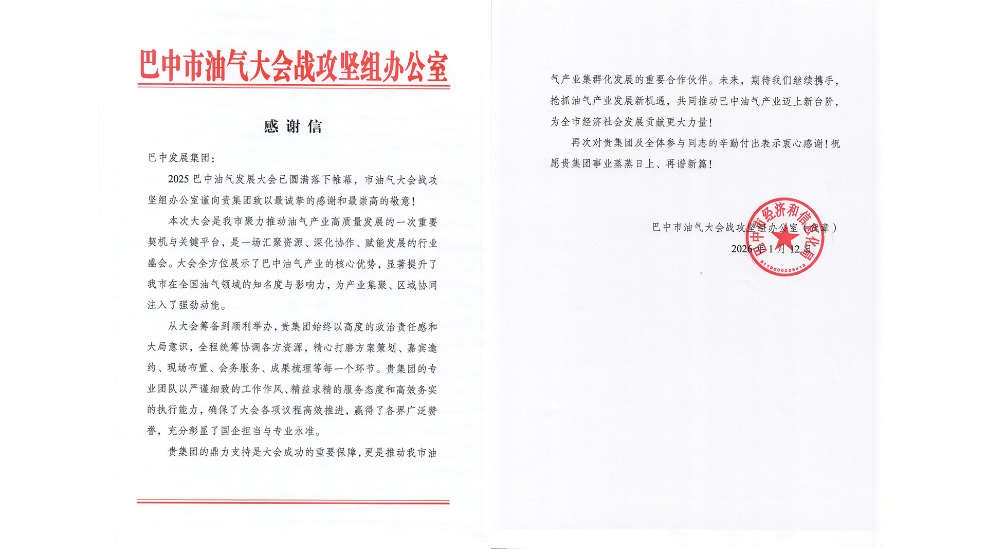 近日,巴中發(fā)展控股集團(tuán)有限公司收到來自巴中市低空經(jīng)濟(jì)發(fā)展工作專班辦公室和巴中市油氣大會(huì)戰(zhàn)攻堅(jiān)組辦公室的感謝信。信中對2025年巴中發(fā)展集團(tuán)積極支持低空經(jīng)濟(jì)產(chǎn)業(yè)和推動(dòng)油氣產(chǎn)業(yè)高質(zhì)量發(fā)展表示感謝。